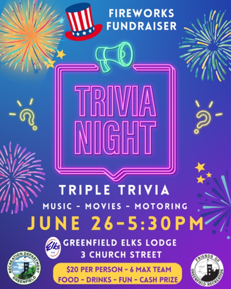 The first annual Friends of Greenfield Recreation Triple Trivia Fireworks Fundraiser was held on Thursday, June 26, 2025 at the Greenfield Elks lodge at the corner of Federal and Church Street. Fifty five people attended, and with food and shirt sales and a 50/50 raffle, over $1500 was raised!